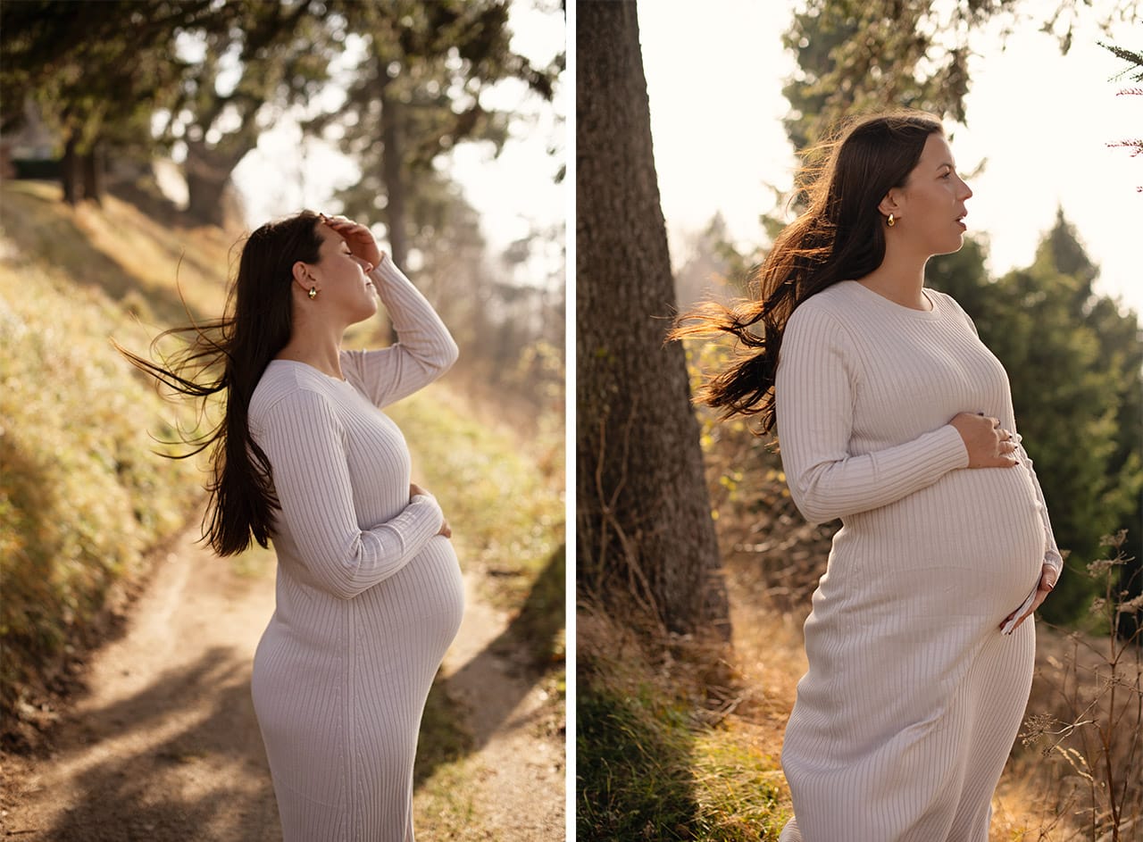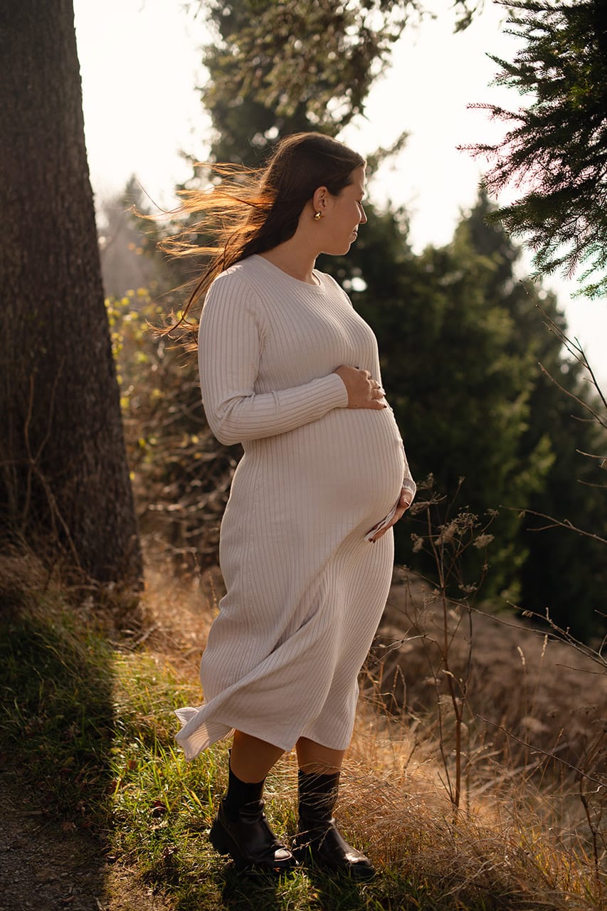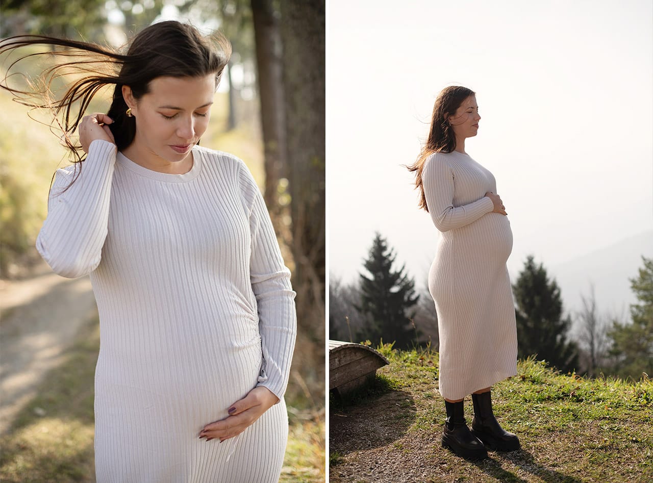 Nosečnost ima svojo tiho moč. Ni glasna. Ne potrebuje velikih gest. Je v drži telesa, kako se dotakneš trebuščka, kako se za trenutek ustaviš in ostaneš v sebi. Prav to sem želela ujeti tisti dan. Ne popolnosti, ampak resničnost. Malo preprostosti, malo ljubezni in kanček čarobnosti. Ravnovesje.