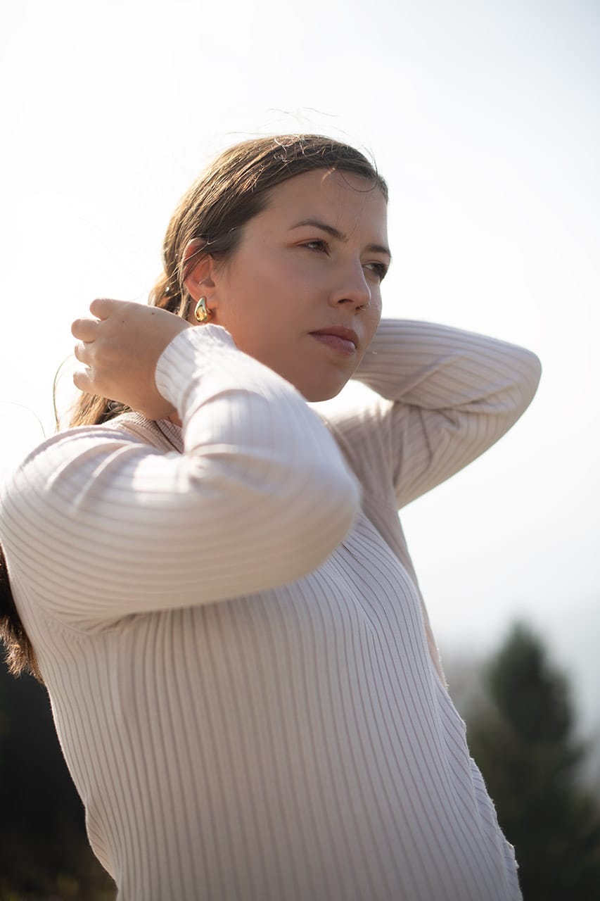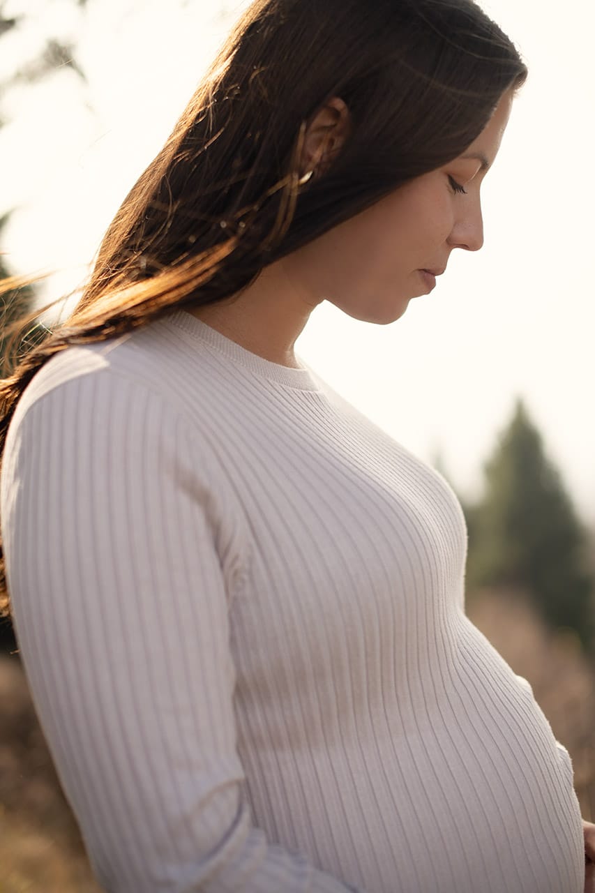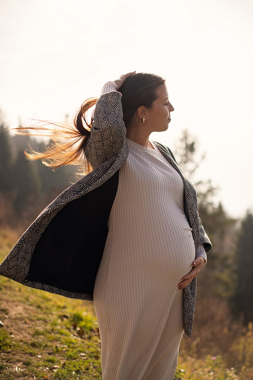 Nosečnost ima svojo tiho moč. Ni glasna. Ne potrebuje velikih gest. Je v drži telesa, kako se dotakneš trebuščka, kako se za trenutek ustaviš in ostaneš v sebi. Prav to sem želela ujeti tisti dan. Ne popolnosti, ampak resničnost. Malo preprostosti, malo ljubezni in kanček čarobnosti. Ravnovesje.