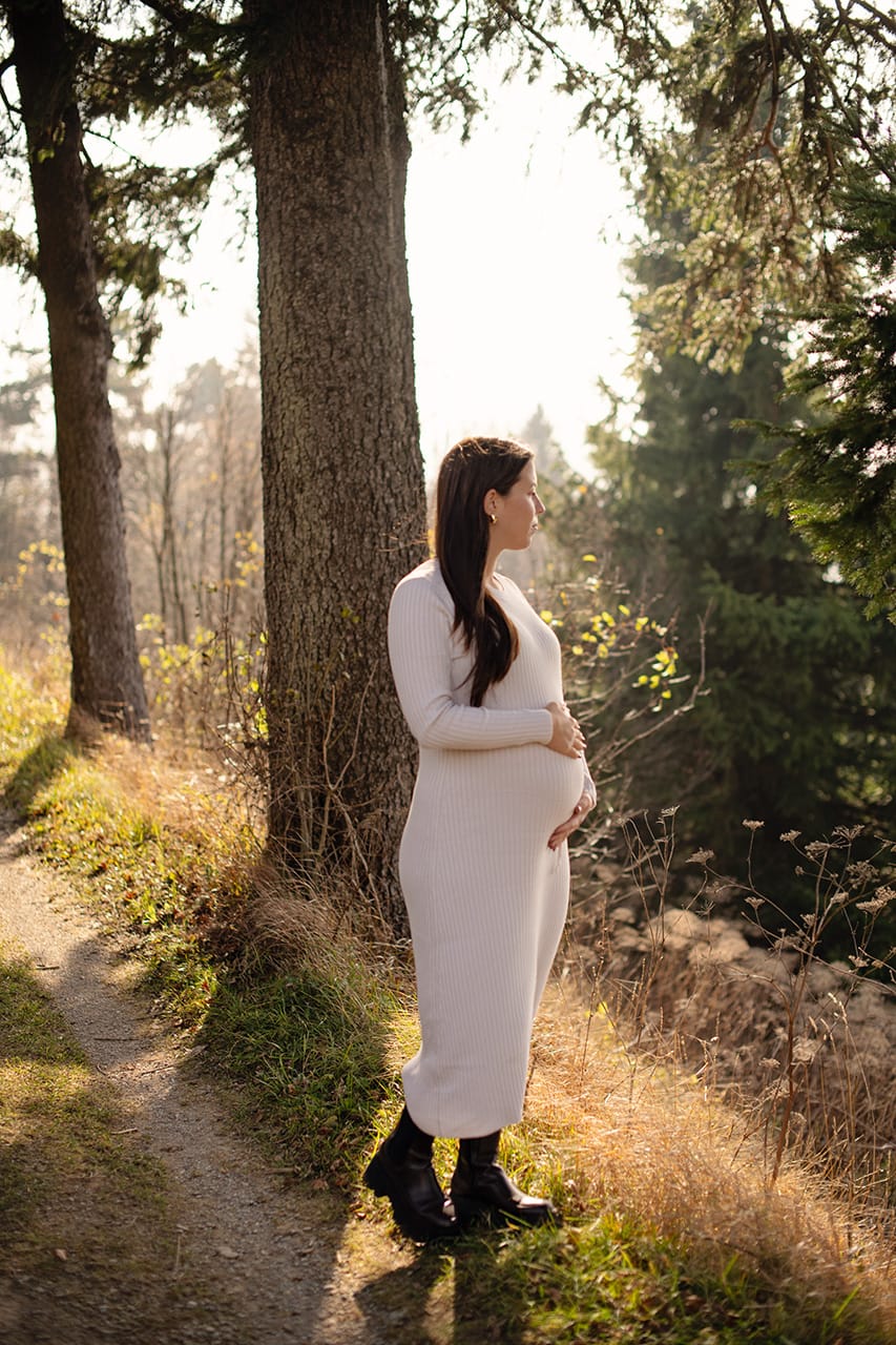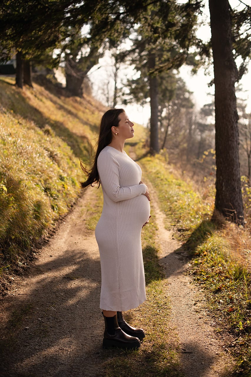 Hladen novembrski dan je bil. Čisto pravi za zgodbo – takšno, ki se piše z vetrom v laseh, mehko svetlobo in iskricam v očeh. Poti so bile že jesensko obarvane, jutranje meglice so se počasi razblinile v sončen dan. Popolno za nosečniško fotografiranje z Majo. Hitro sva ujeli ritem. Brez hitenja, brez togih poz.